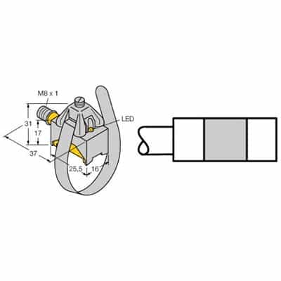 “Turck BIM-KST-AP6X-V1131 Cylinder Position Sensor w/Clamp; M8x1 QD Connector; 3-Wire DC, PNP Output, 10 – 30 VDC Operating Voltage Range; -25°C to +70°C Operating Termp Range; IP67 Protection”